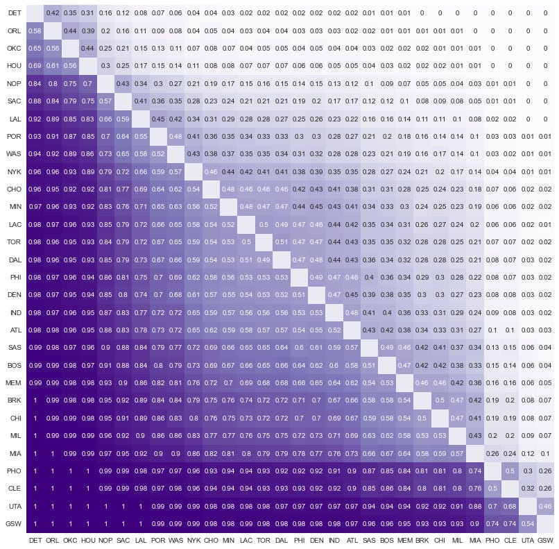Rather than tackle any individual question, we’re going to try to tackle them all at once. You read the following plot as: The probability the team on the Y axis is better than the team on the X axis is the value in the square. Golden State has a 74% chance of being better than the Cavaliers and a 54% chance of being better than the Jazz.