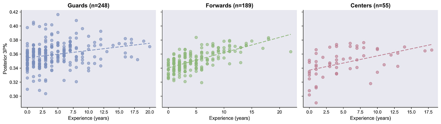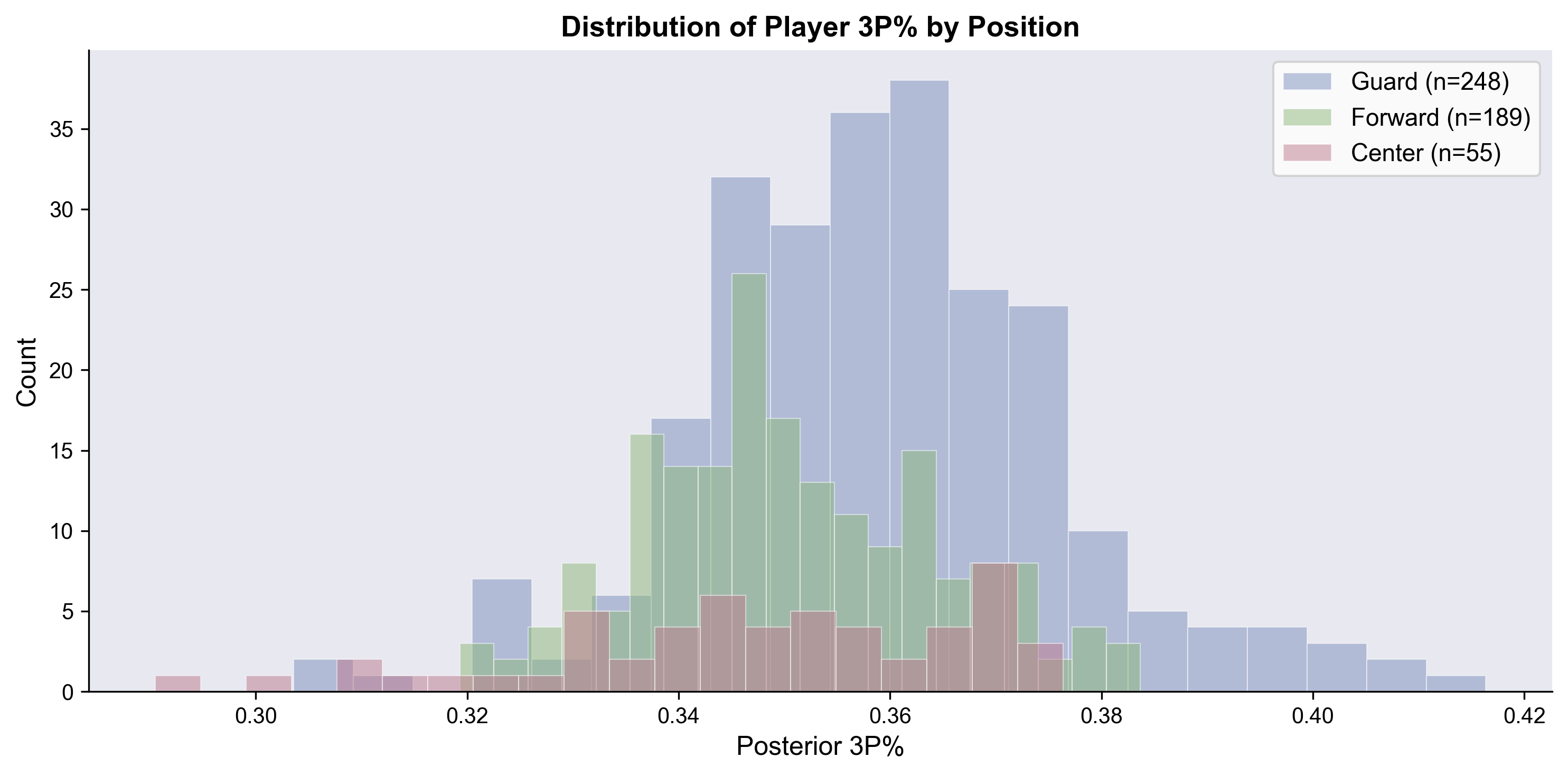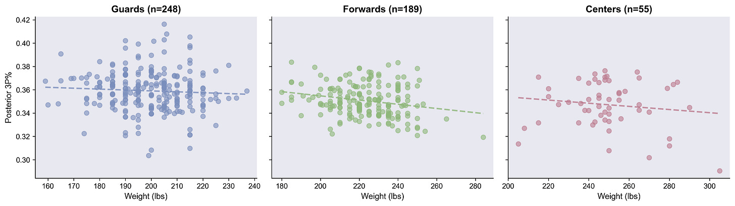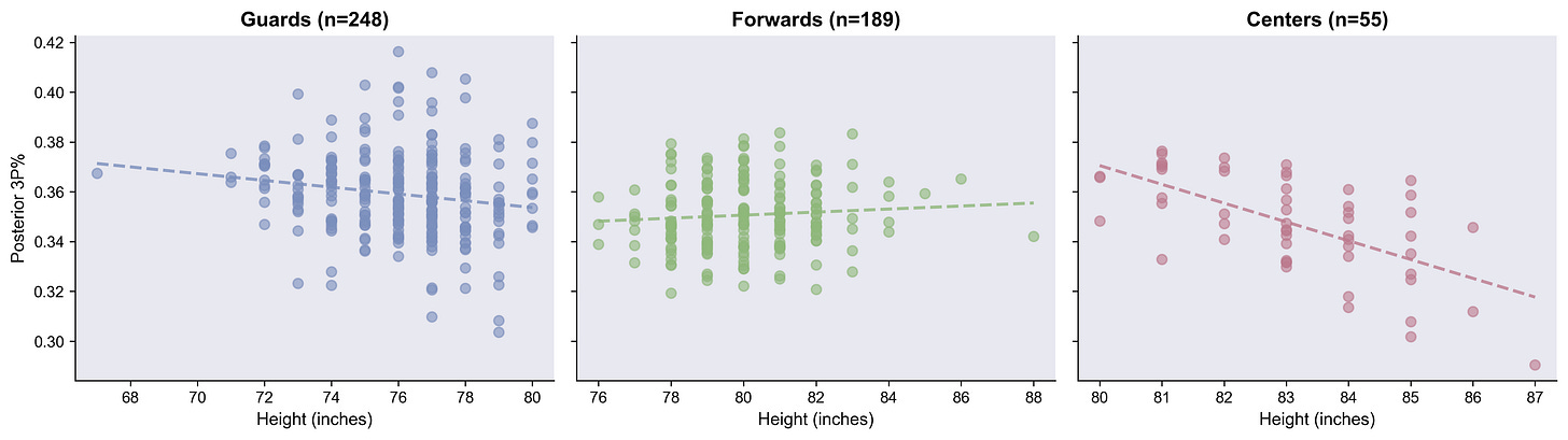 Here’s the distribution of 3PT% estimates for all players in the league, broken out by position. This distribution is so interesting to me. Tons of variance, which makes sense, but there’s this long-tail shoulder on the guards above 38%.