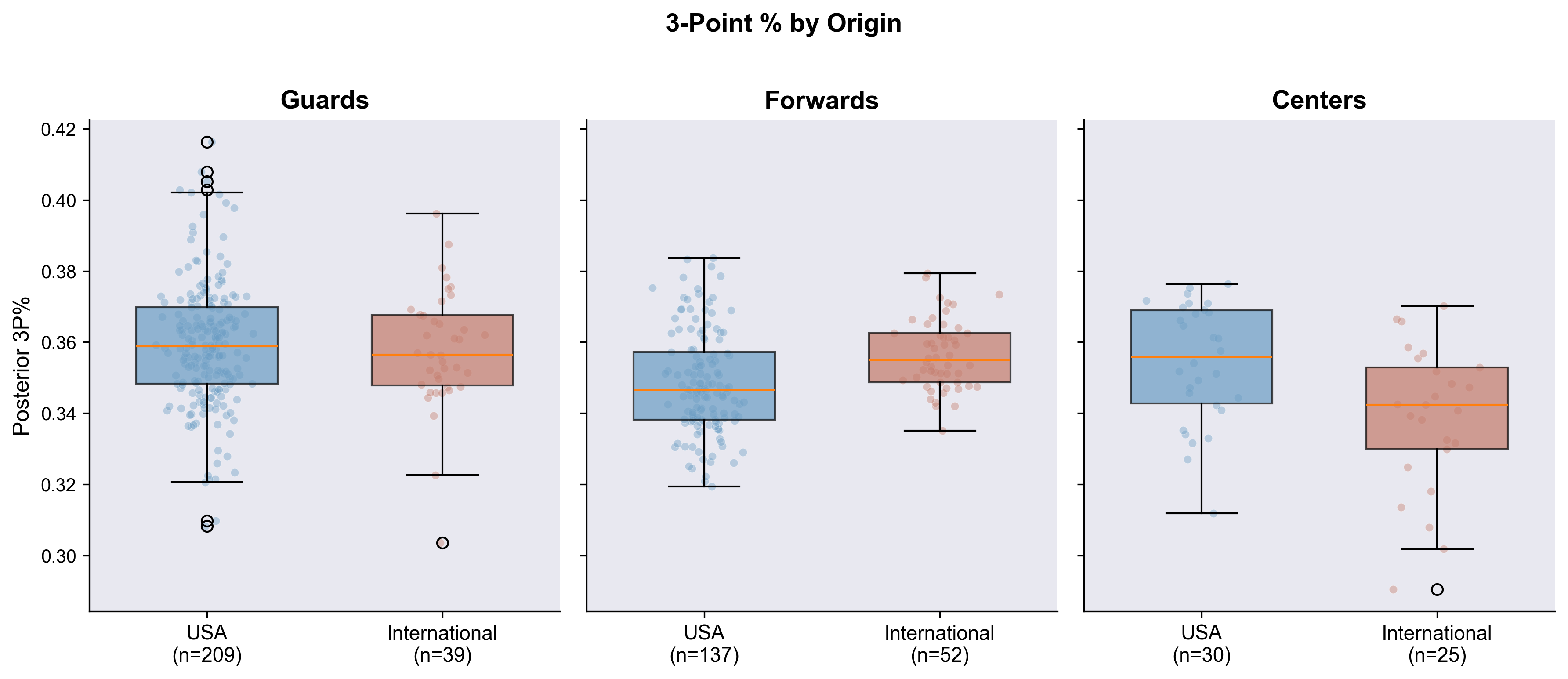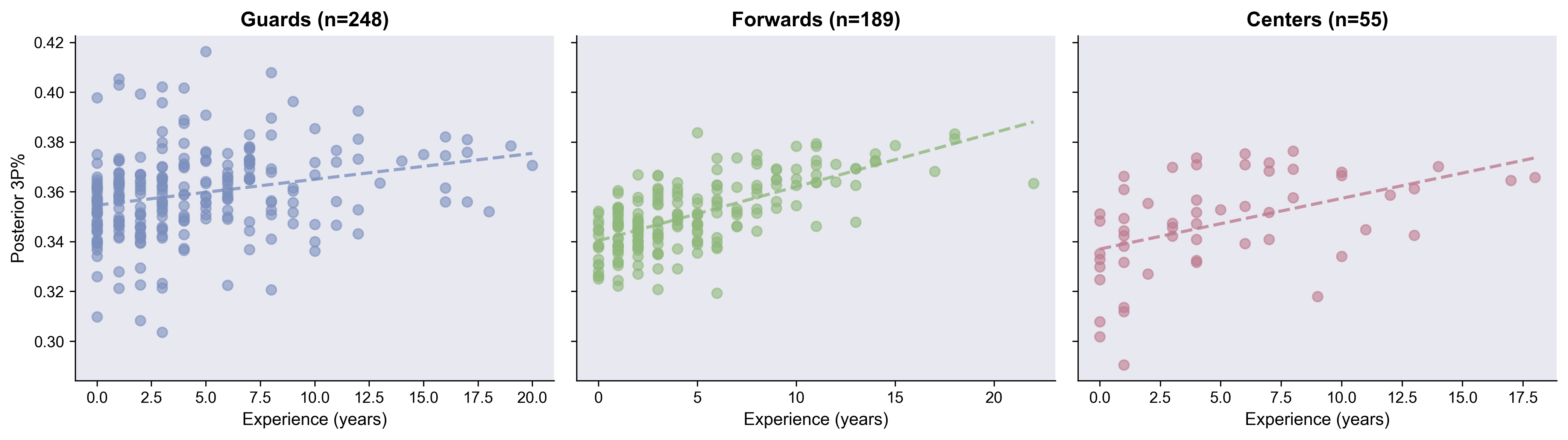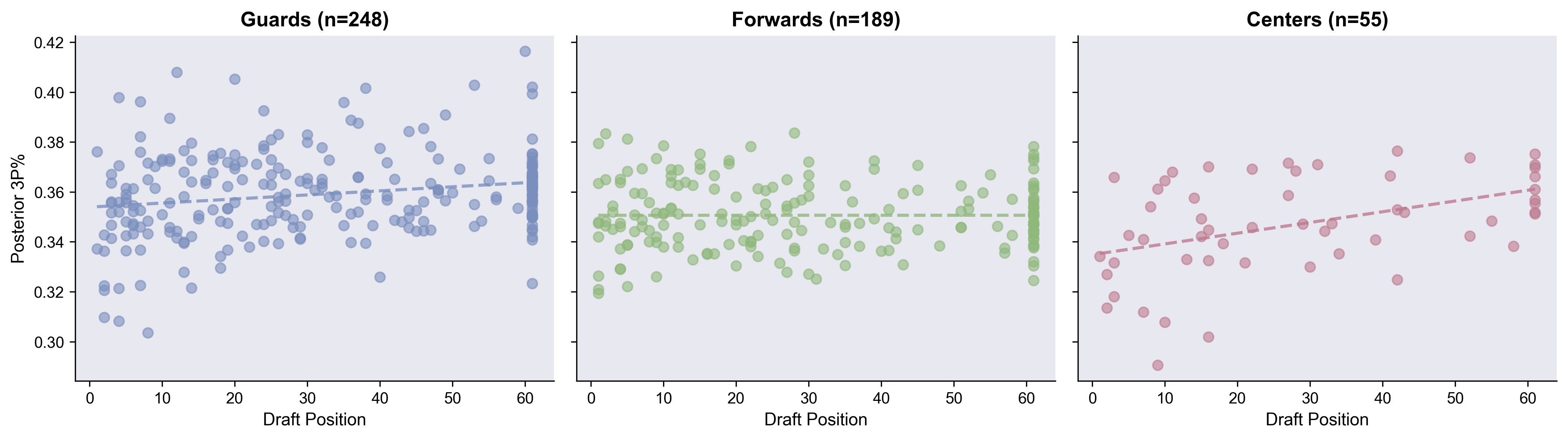 Here’s the distribution of 3PT% estimates for all players in the league, broken out by position. This distribution is so interesting to me. Tons of variance, which makes sense, but there’s this long-tail shoulder on the guards above 38%.
