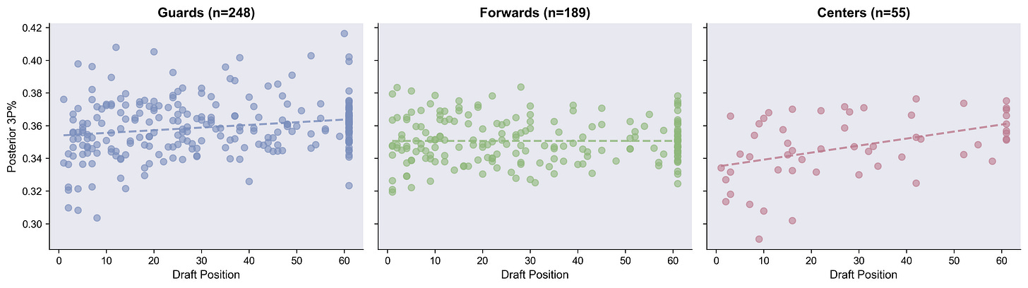 Later draft positions, especially for big men, predicts higher three point shooting. If you think about the archetype of centers that are drafted early vs later (and who is picked up undrafted), this isn’t as counter-intuitive as it seems. To me, the main question is, why didn’t we see this in our FT modeling.