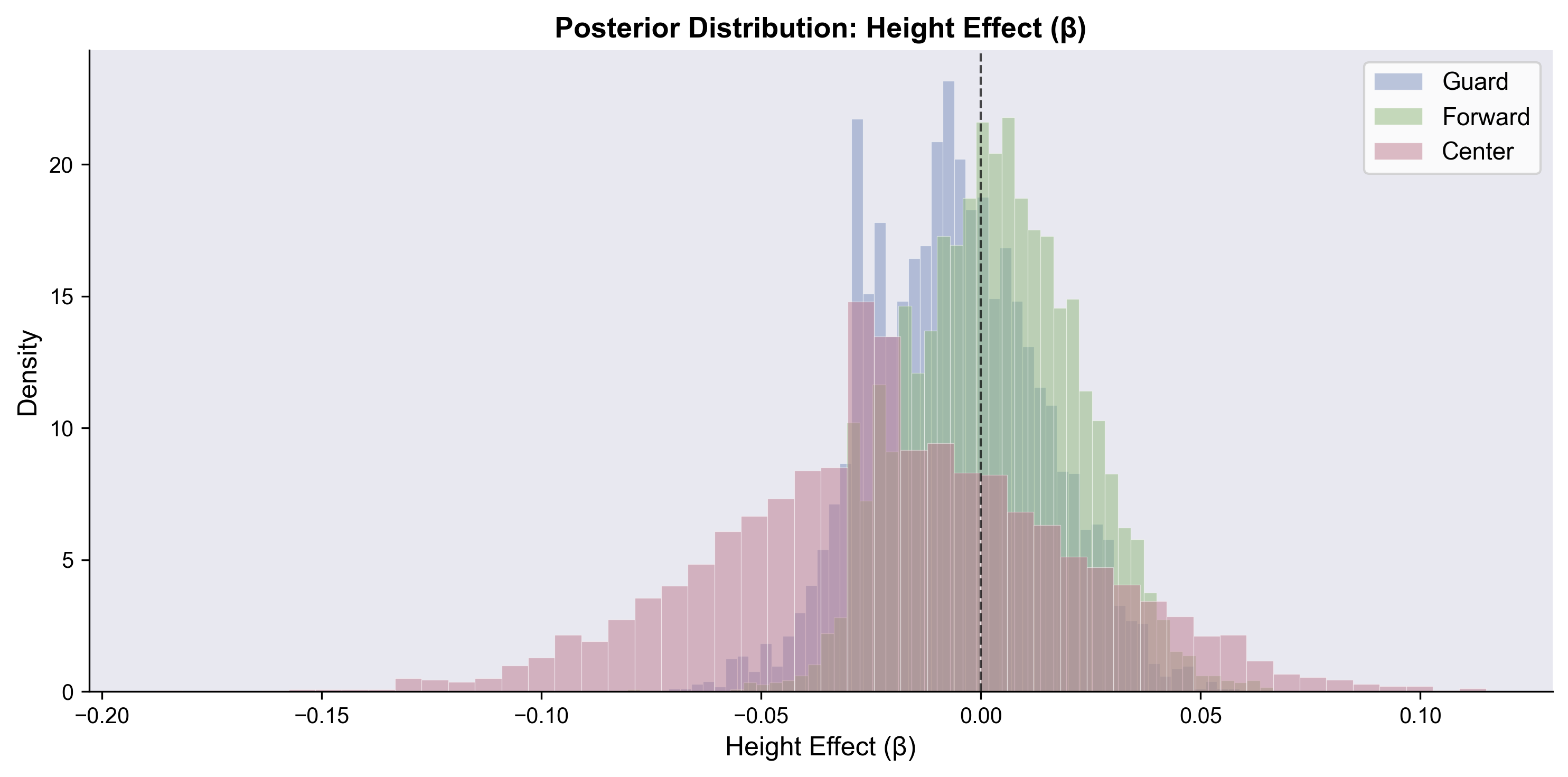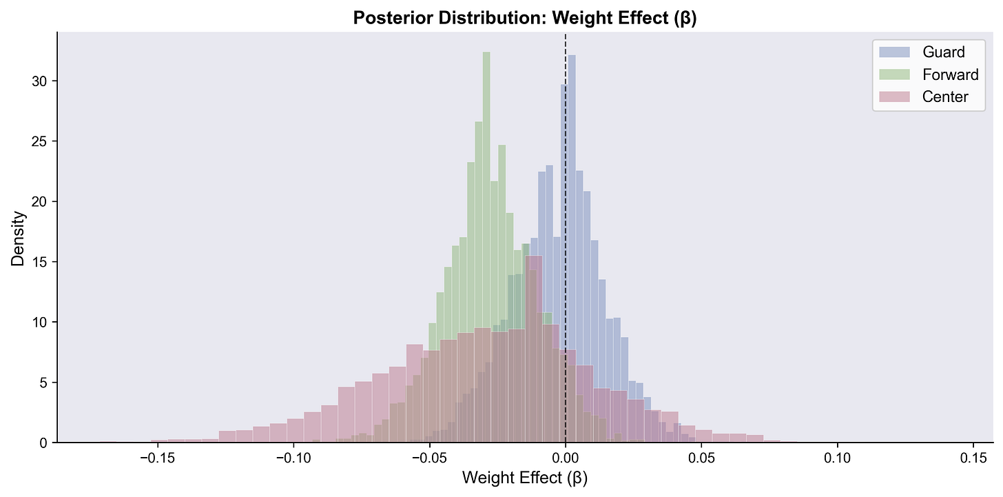 A lot of density for the Center position’s weight goes negative, which I can buy. Guards, perfectly centered on zero, which also makes sense. Lighter centers might be better at shooting threes, while weight doesn’t affect guards as much.