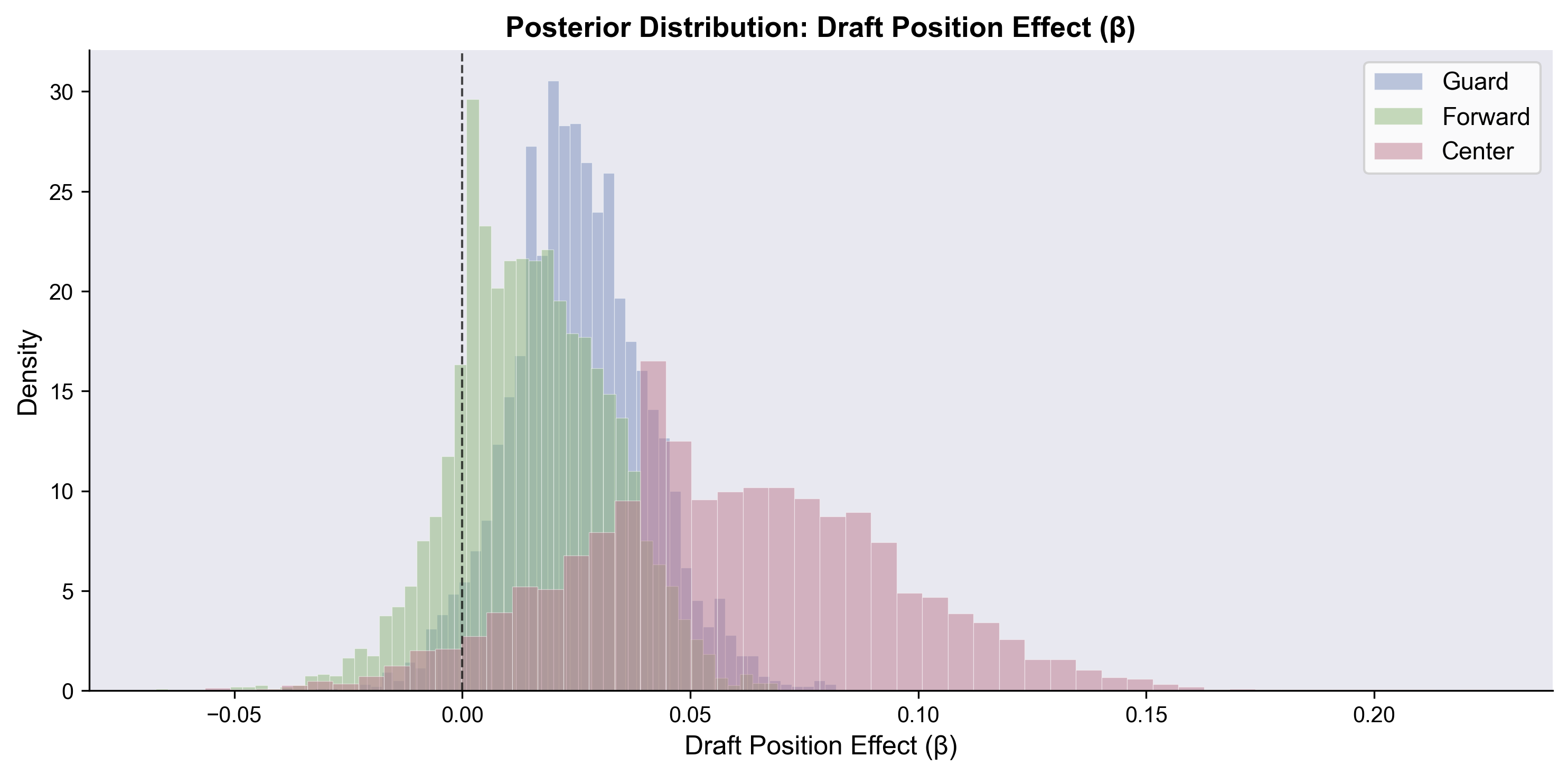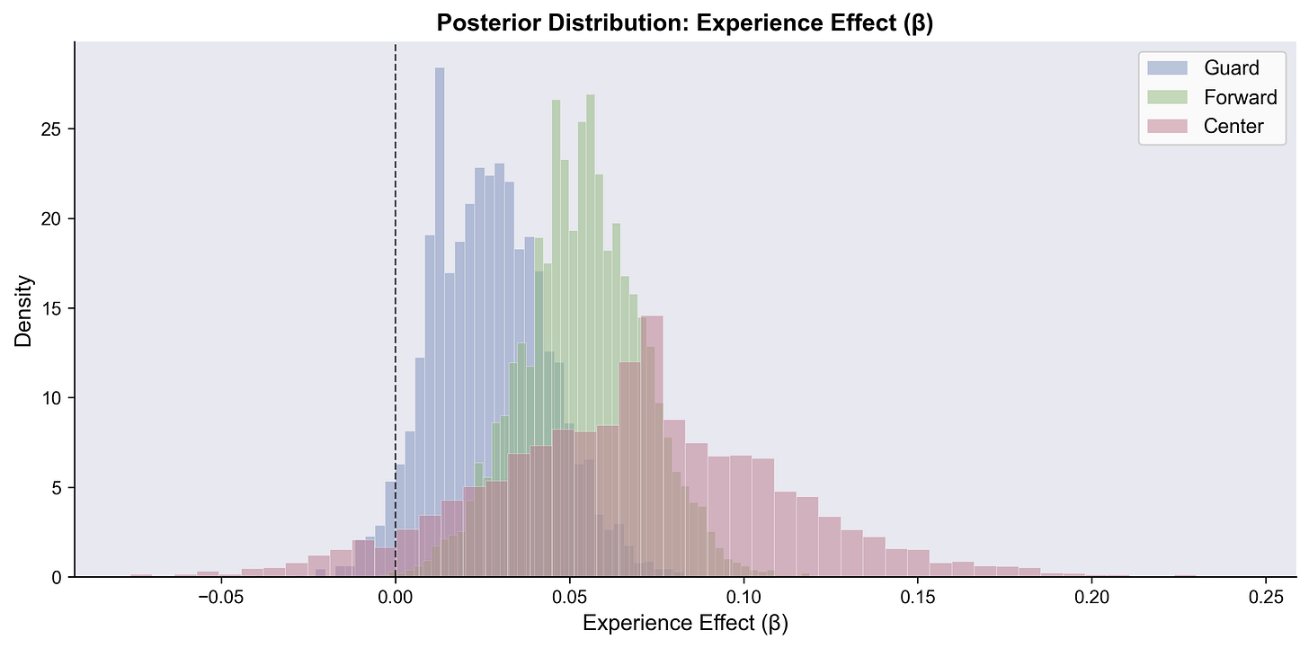 The full Stan model is at the bottom of this post. At a high level, we’re using a hierarchical binomial model, pooled by player position (guard, forward, center), using the following features: