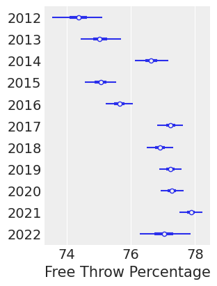 Here is the model's estimates for Free Throw Percentage each year since 2021: