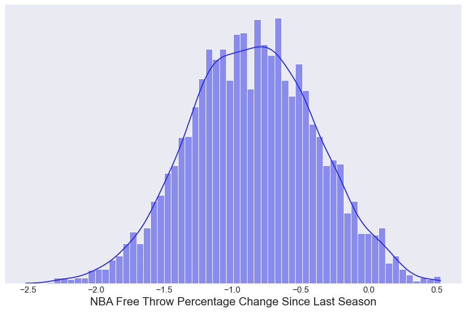 The model is fairly uncertain about the actual difference between this season and last, but it’s most likely down one percentage point. Also, there's very little chance this season's free throw percentage is as good as last year's.