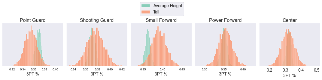 Now, let’s incorporate player height into the model. What we’re asking here is Is a tall Point Guard a better 3PT shooter than an average height Point Guard? And similarly, is a tall Center a better 3PT shooter than an average height Center? For each position, we looked at how height affects 3PT shooting. Below we are comparing an average height player at each position to a tall player (4 inches taller than the average height for the position).