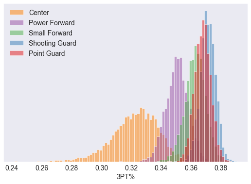 The model can’t distinguish between 3PT shooting for Point Guards, Shooting Guards, and Small Forwards. A simple “point estimate” model where you put a number on each position would say Shooting Guards are the best, but since our model keeps track of uncertainty, we can see it’s nearly as likely that Point Guards or Small Forwards are best.