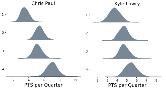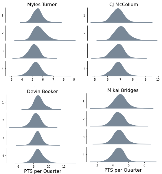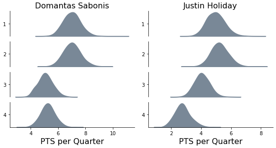 Here are some examples where the model is fairly certain the player drops in performance later in the game. Domantas Sabonis drops from about 7 PTS per quarter in the first half to 5PTS per quarter in the second half. Similarly, Justin Holiday seems to have a steep drop off in the final quarter of the game.