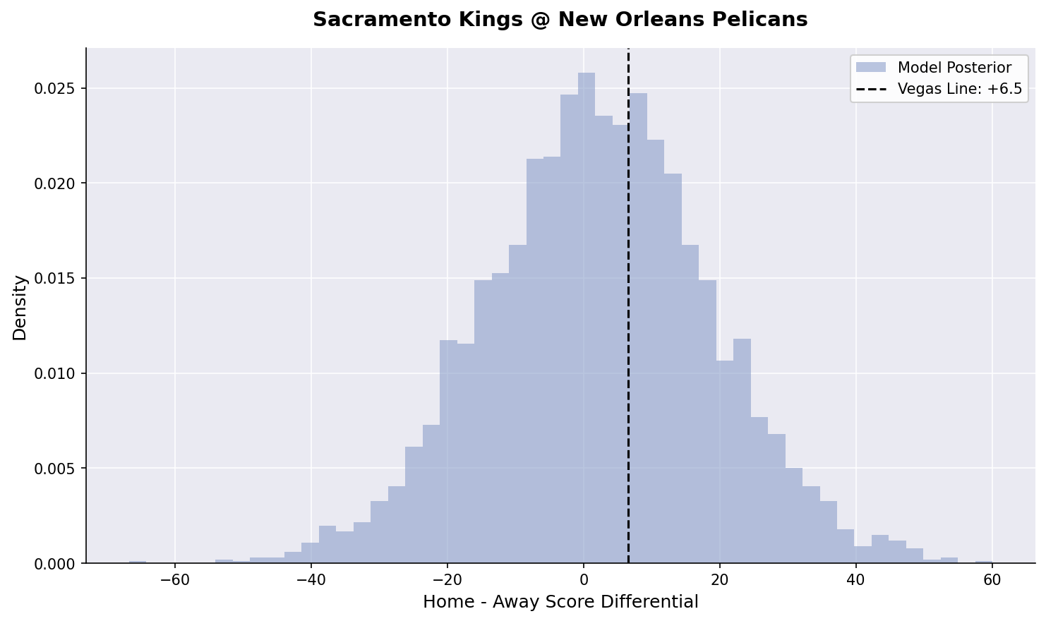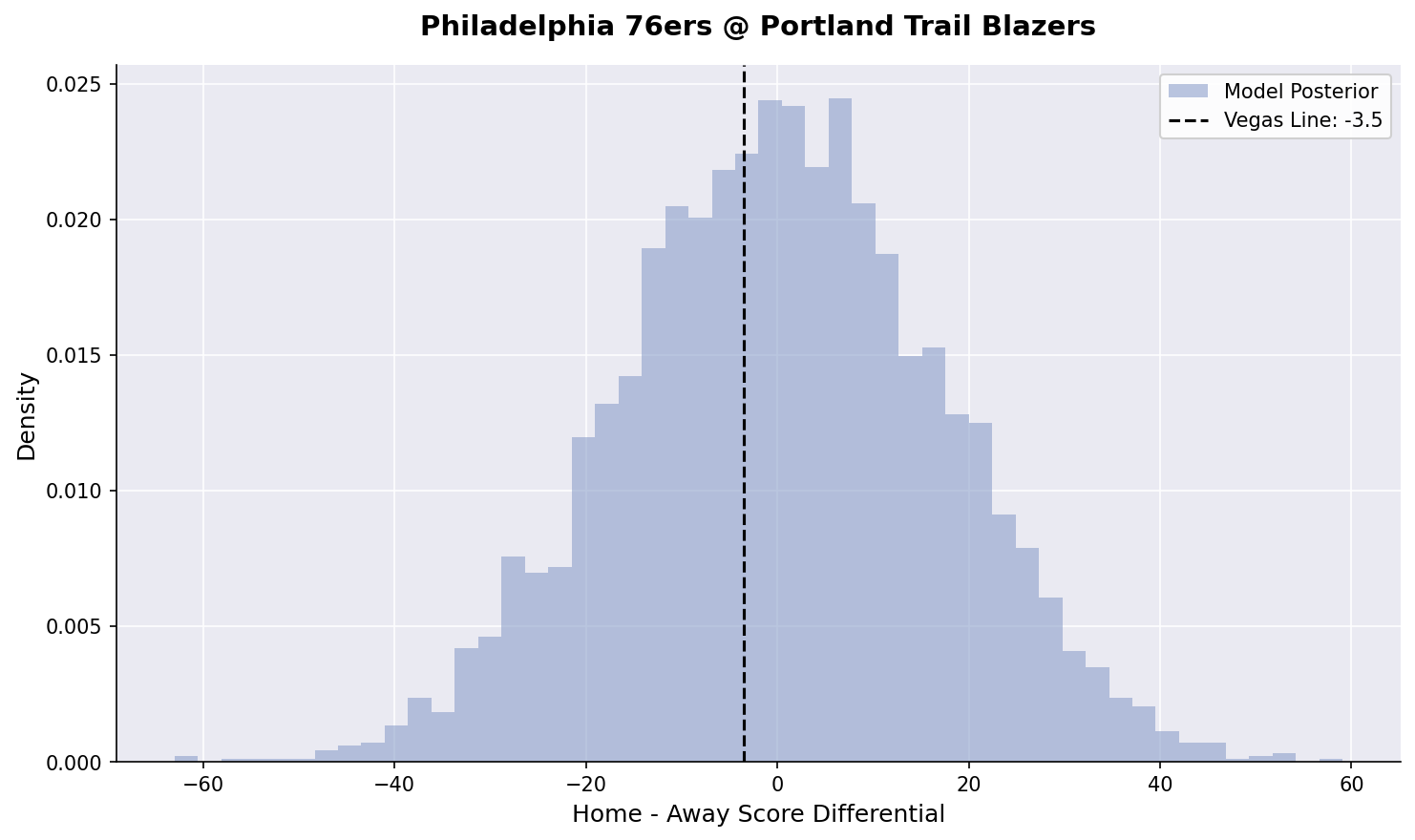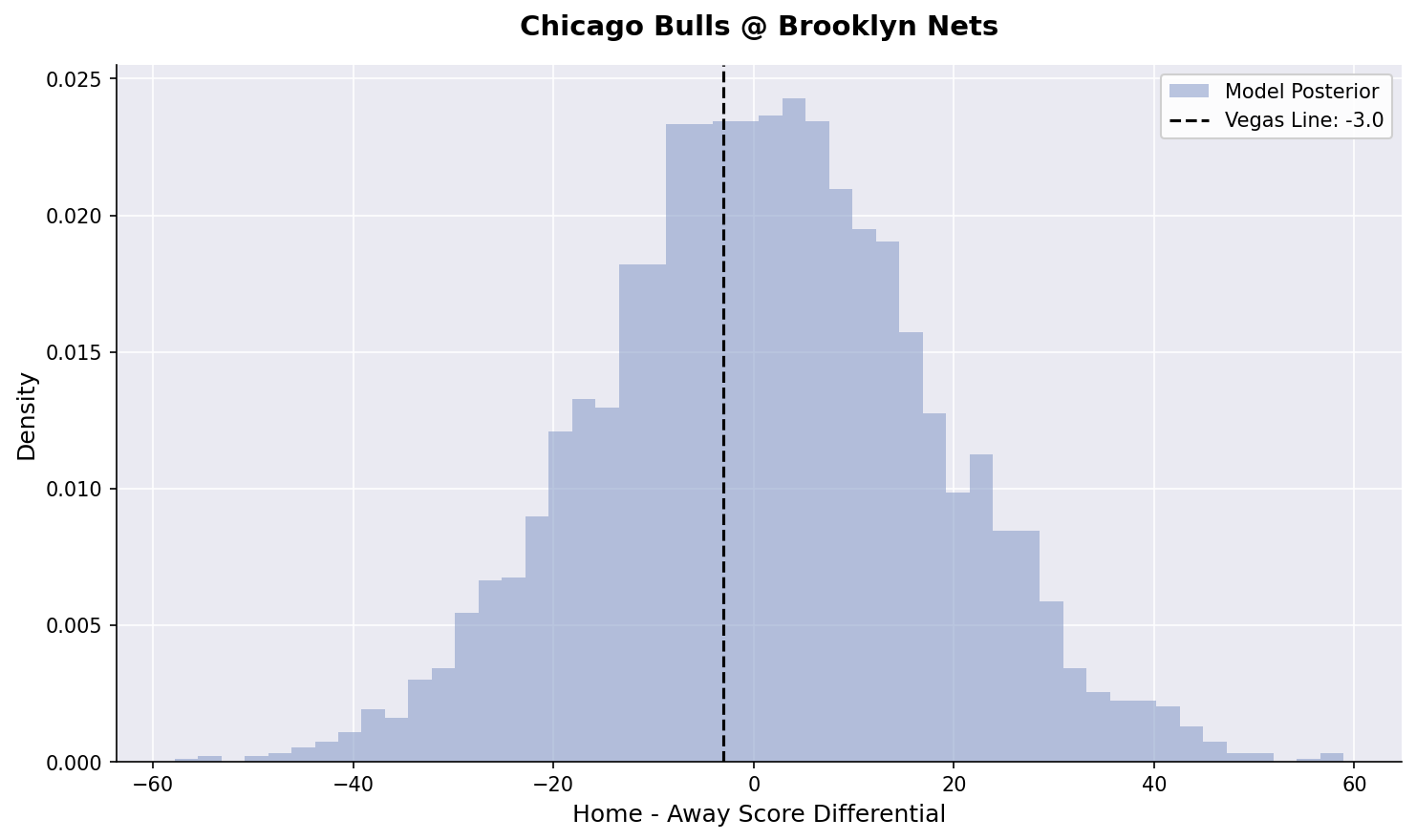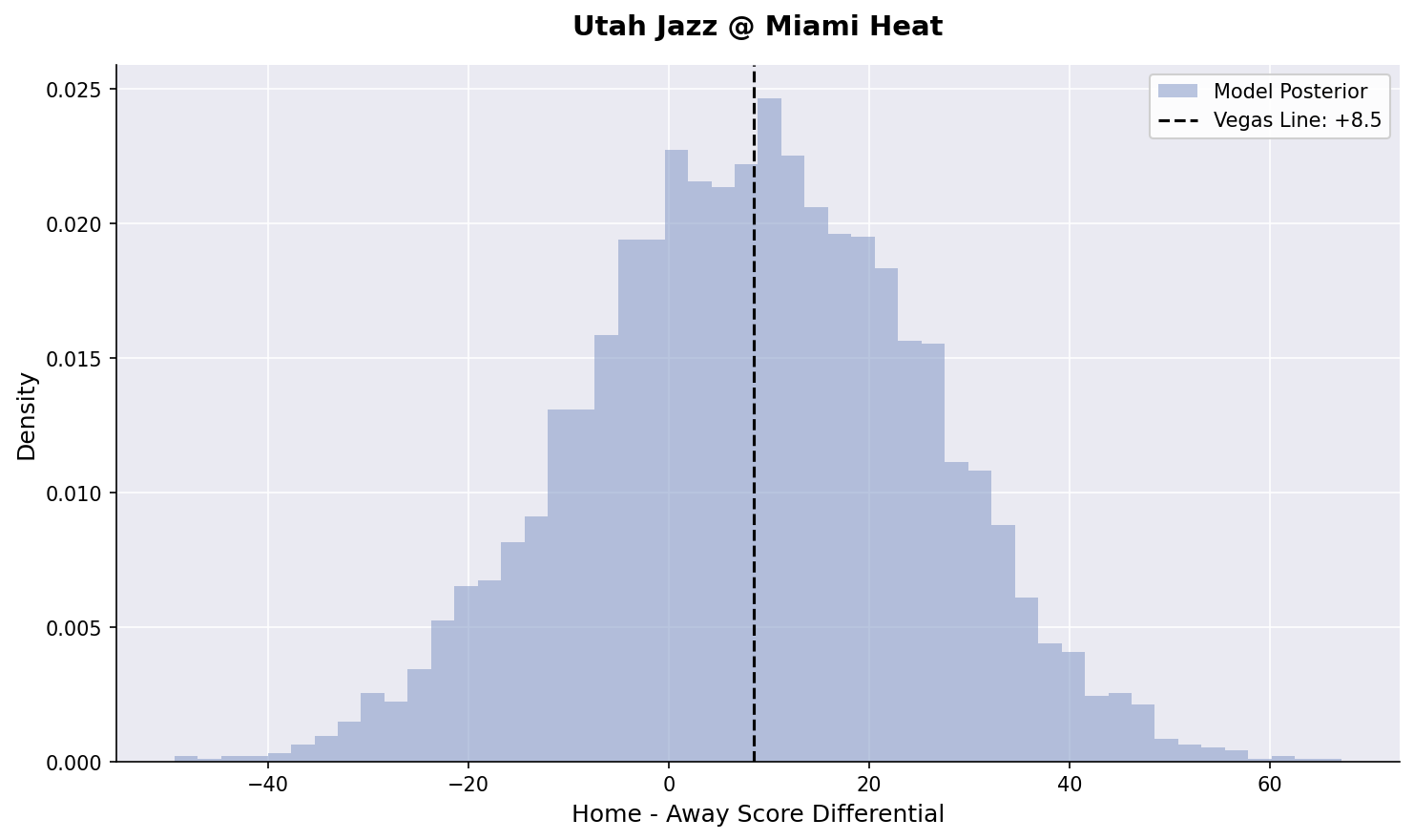 We’ve fired back up our Bayesian hierarchical models. Here is our posterior estimates for tonight’s games: