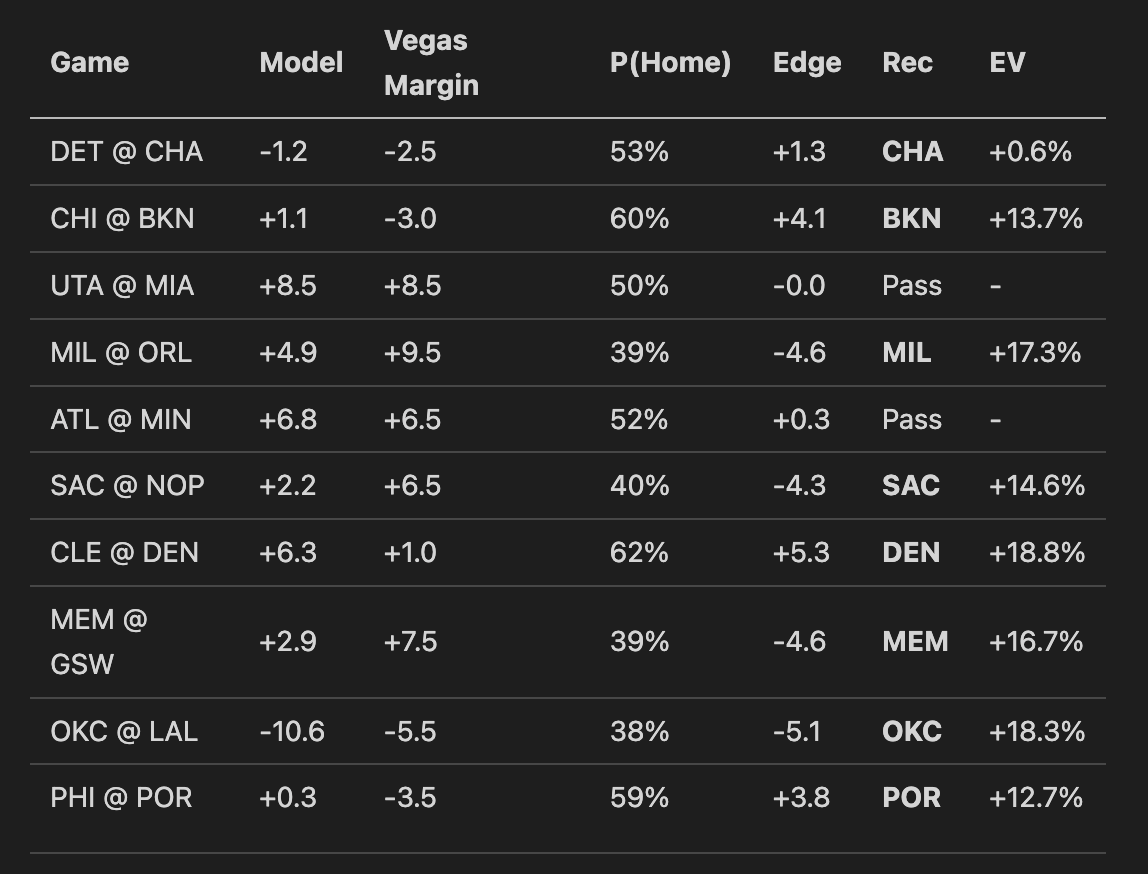 Many of our previous posts have detailed how we predict NBA game outcomes. In the future, we’ll go into more details into our updated model. We won’t rehash it here, but here’s some links: