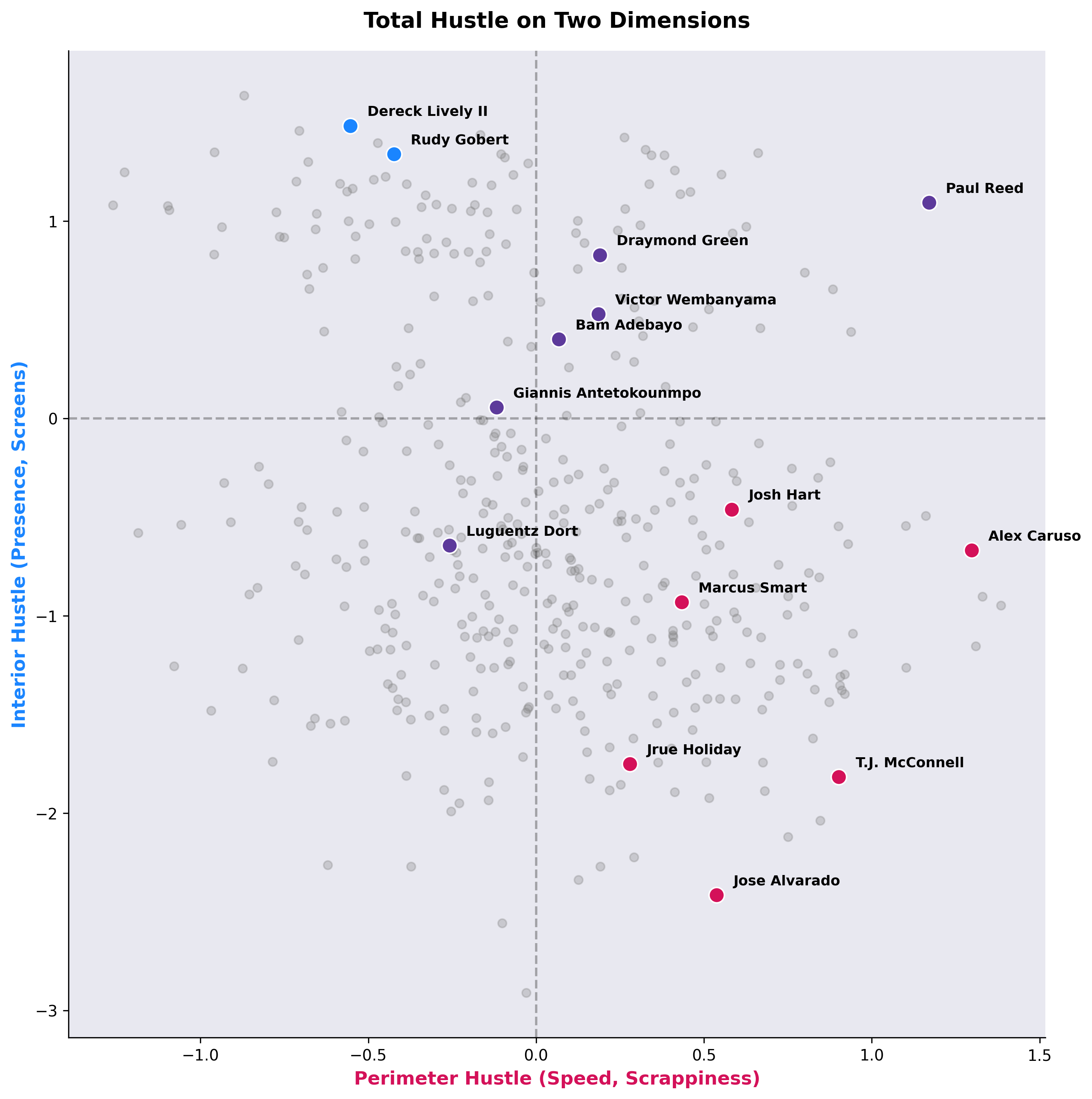 What’s funny, to me at least, is our poisson estimates use per-minute stats, which is usually a pretty naive way to model NBA performance. But in the case of hustling, I like it. What you want is someone who’s grinding every minute of the game.