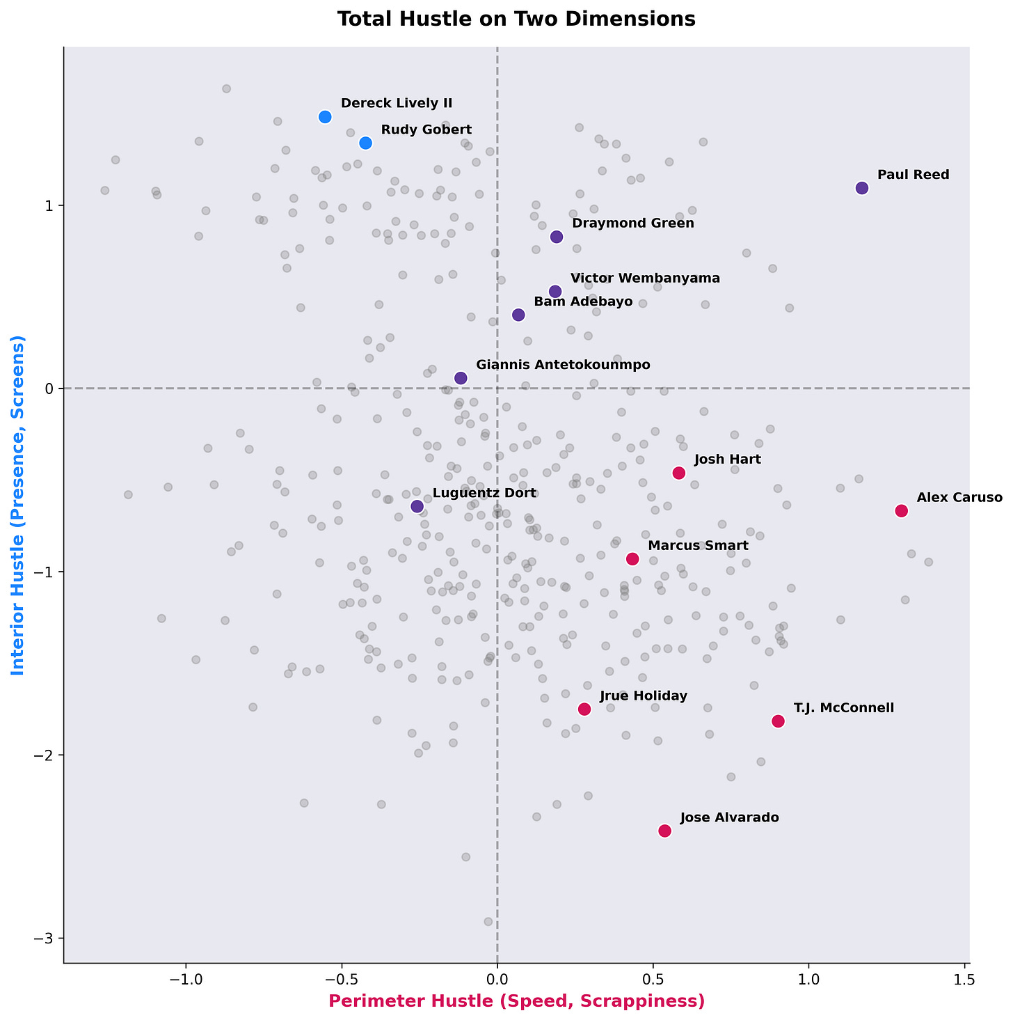 And we can break each player out on both dimensions. In line with expectations, centers have higher interior hustle latent skills, and guards have higher exterior hustle latent skills. The players in the top right are those who score high in both regards.