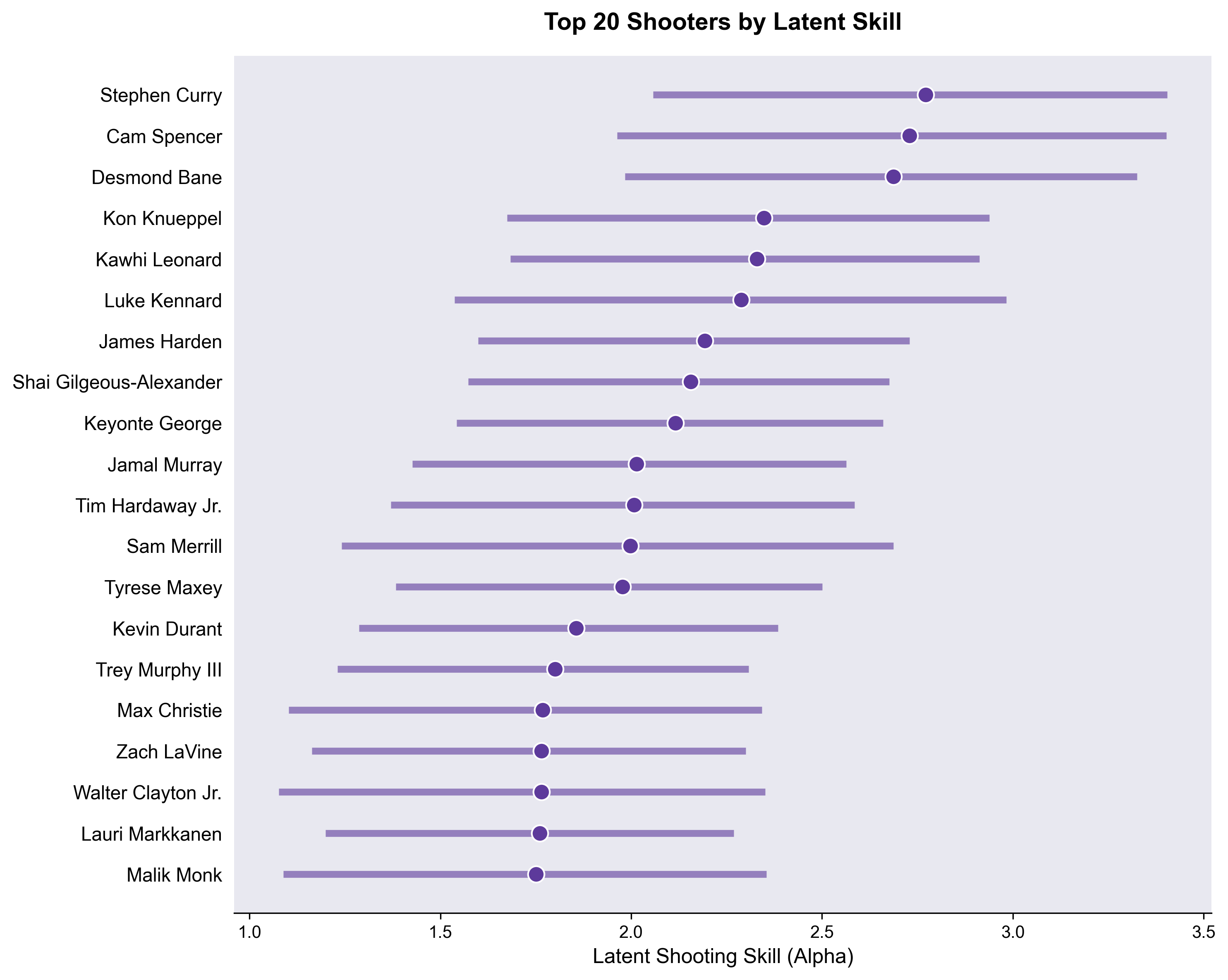 There’s a lot more we want to do. There are so many more events that our latent shooting ability variable can be used to predict (corner 3s, mid range shots, etc), which can help tighten up our estimates. For example, knowing how well someone shoots from mid range should help tighten up our estimate for how well they shoot from the free throw line. I’m looking forward to incorporating this data. More broadly, I’m becoming interested in these latent variables/vectors that can be used to predict specific events.