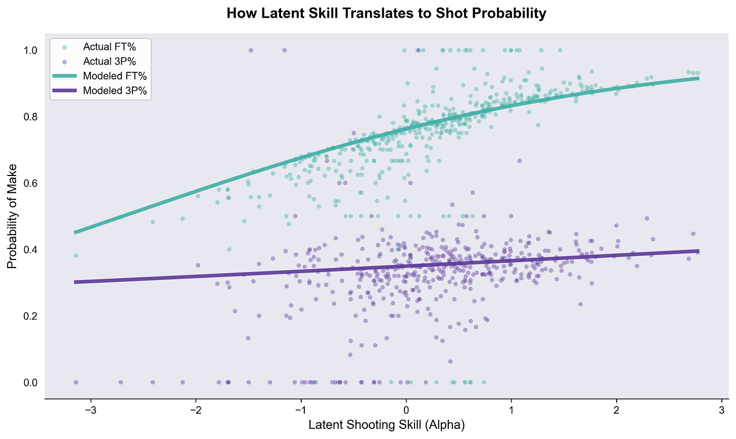 // Estimates a single latent "skill" per player that drives both FT% and 3P%