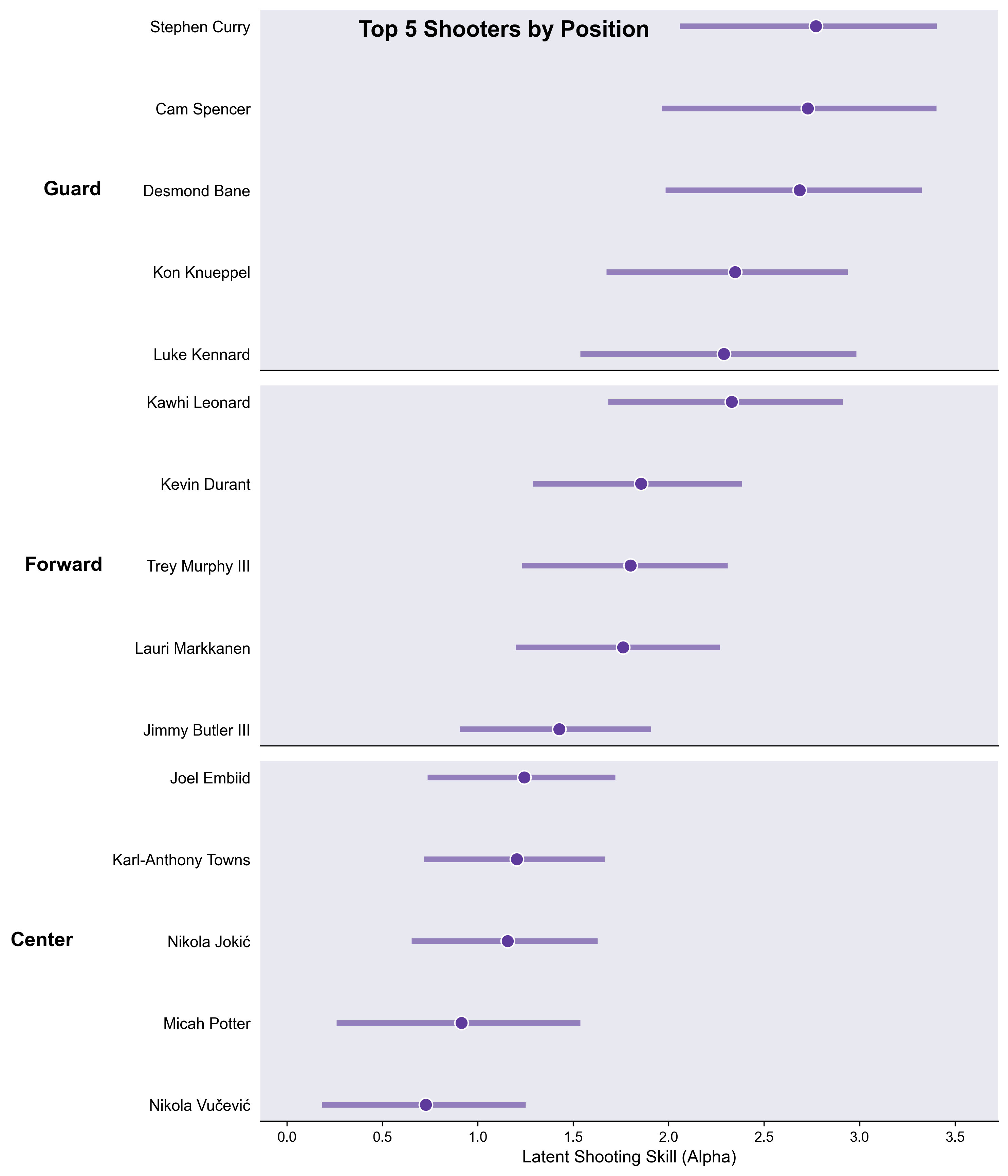Here’s our estimate for latent shooting skill for the top 20 players in the NBA, and then broken out by position below.