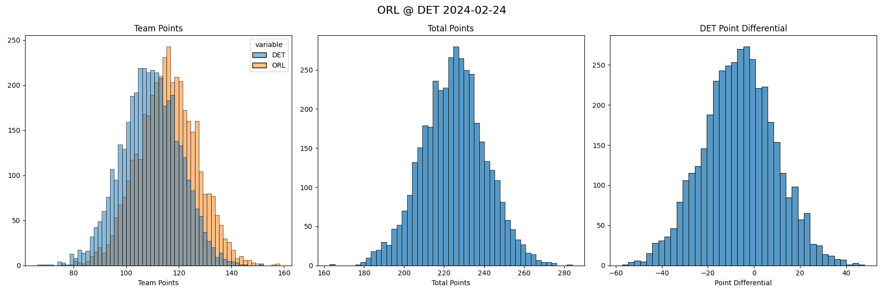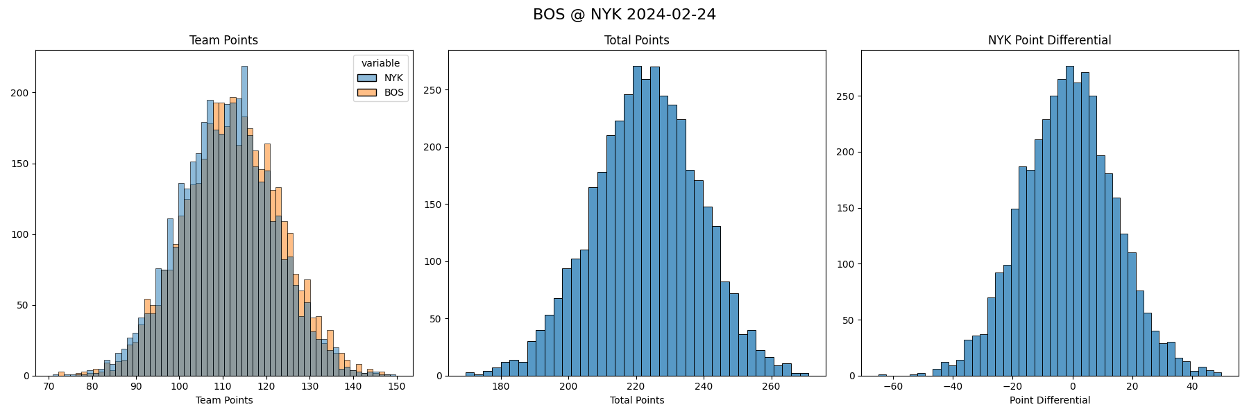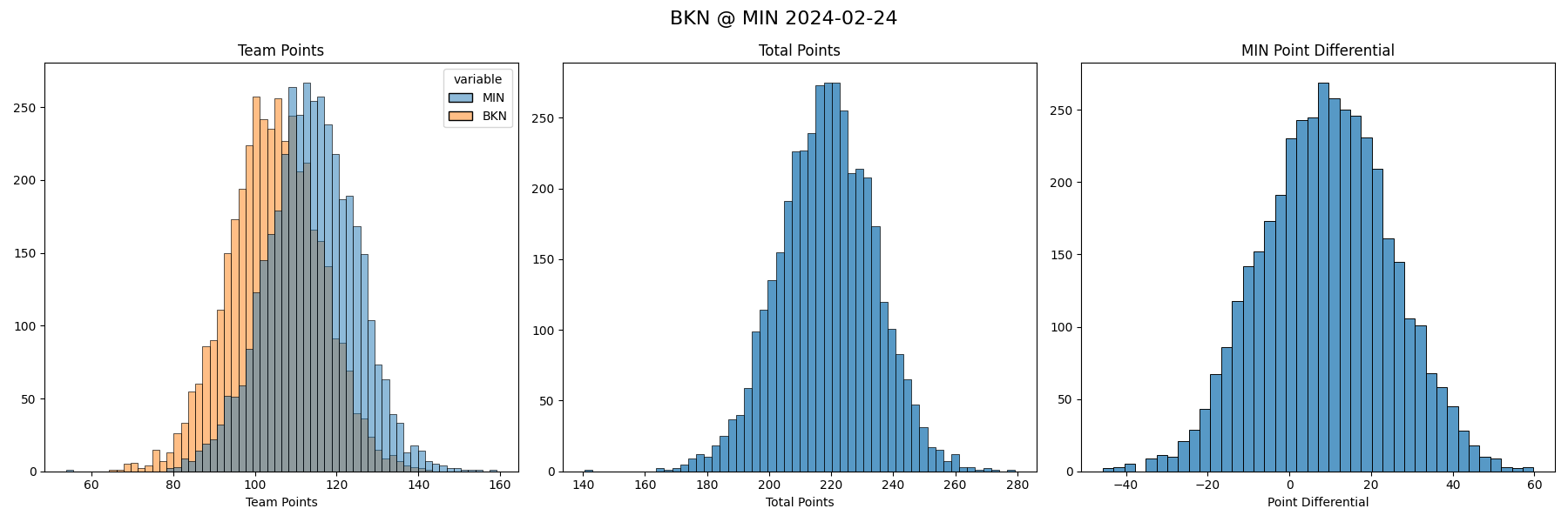 Since we have a fully Bayesian model, we can get point estimates (pun), but there is also uncertainty in every estimate. So we can get not just which team our model thinks will win, but their win probability. And not just how many points they are likely to win by, but: what’s the percent chance they win by 10 points? what’s the percent chance they win by 11 points? etc.