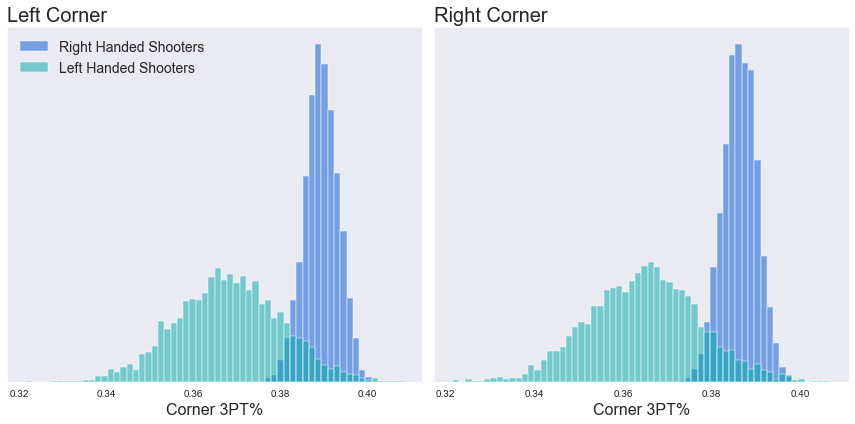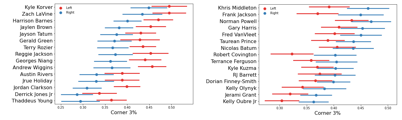 In our post about predicting corner three shooting, we gave examples of players who shoot better from the right corner and players who shoot better from the left corner.