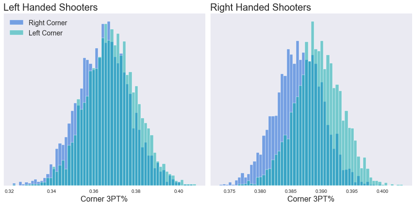 There’s a fair amount of uncertainty in those predictions though. Especially for left-hander shooting ability because we have less data on left-handers. In fact, the model isn’t even certain right-handers are better than left-handers. It gives a 94.9% chance that right-handers can shoot corner 3s better than left-handers. (These probabilistic insights are what I love about keeping track of the uncertainty in models. Also, if we had a frequentist mindset, we would be livid that we missed p=0.05 by just a hair).