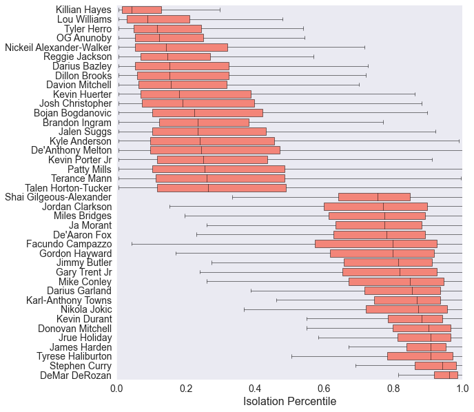 Any individual player has only taken a handful of isolation shots, so it’s hard to get a reasonable estimate of how good a player is at isolation shots. NBA.com uses a threshold of at least 10 isolation shots per player, but this is hacky and doesn’t really help.