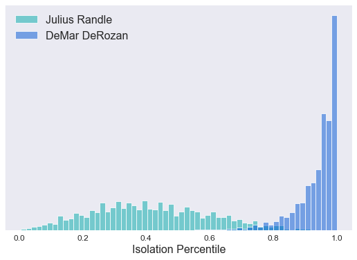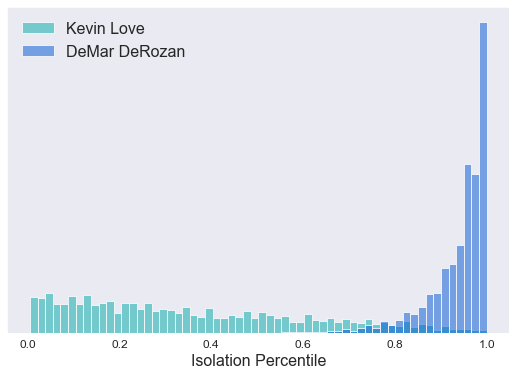 There’s so much data on DeMar DeRozan in isolation, that the model is fairly certain he’s >90th percentile. He’s probably even >95th percentile. Kevin Love, on the other hand, has only taken a handful of isolation shots. So really, he could be anywhere from the worst in the league to around 80th percentile. It’s just hard to say on only 26 isolation possessions.
