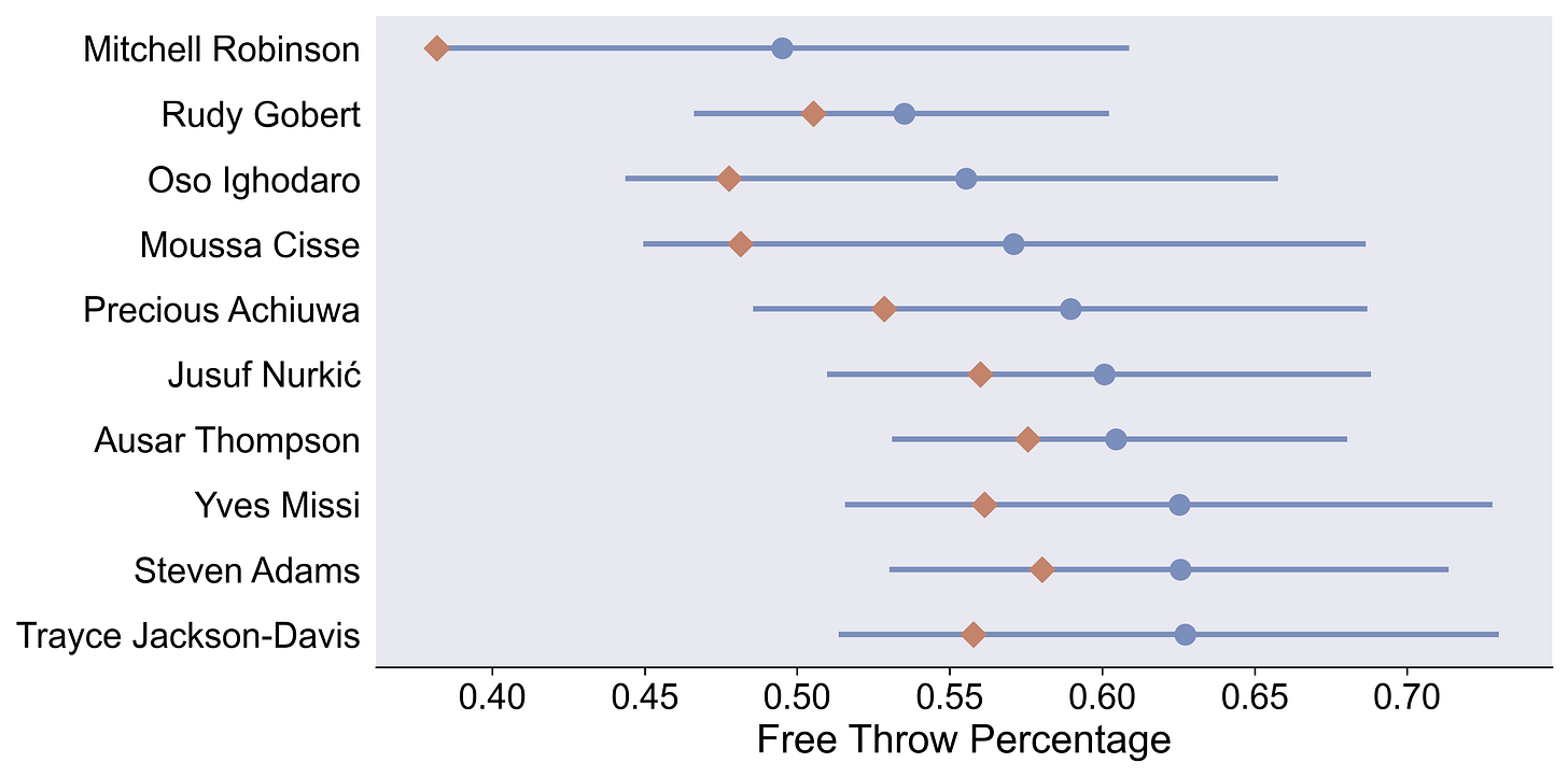 Importantly, if a player has only taken a handful of shots this season, the model assumes that they are basically just an average player. So naturally, we don’t need to do those arbitrary things like only limiting it to players with at least 50 free throw attempts.