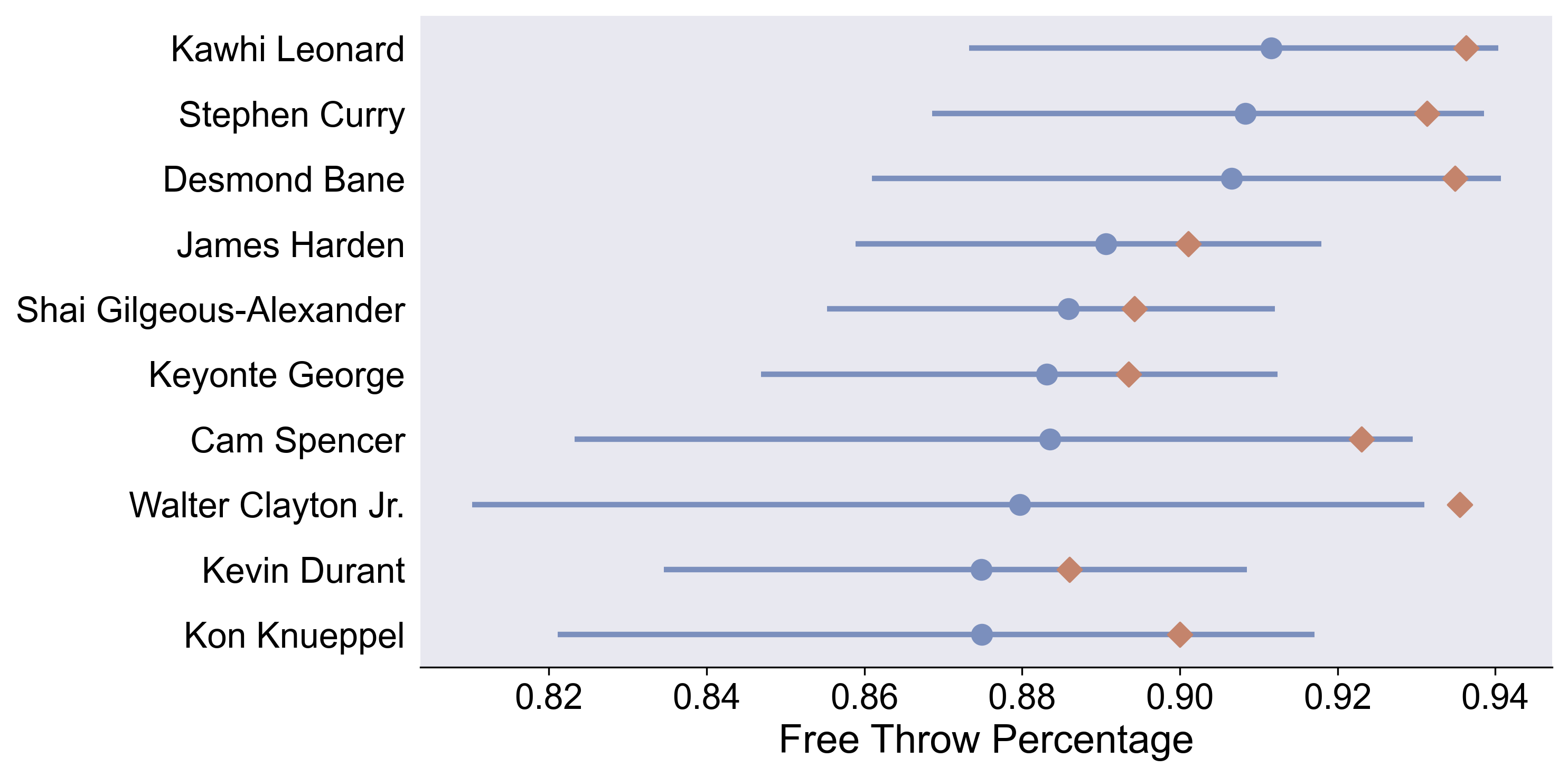 Here are the top 10 shooters this season. The blue dot shows the posterior median, compared to their empirical free throw percentage (orange diamond). I think there’s three important things to point out: