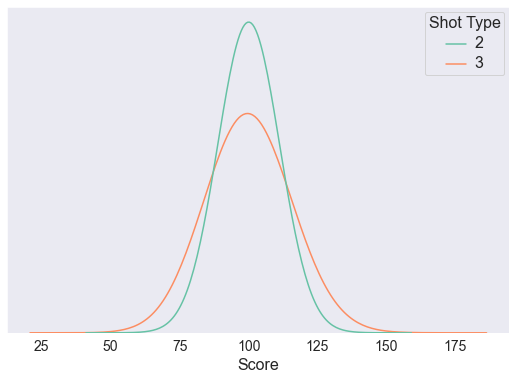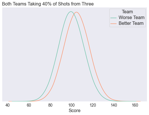 Here, we start by comparing two teams: 1 team takes all 2PT shots, and the other team takes all 3PT shots. Since 2PT shots and 3PT shots have the same expected value, both teams are scoring about 100 points on average. But look at the variance. The 3 point shooting teams have a higher probability of going off for >120 points in a game. This is exactly in line with what the variance-believers are talking about!