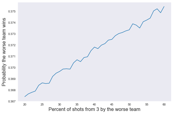 As expected, taking more 3s increases the chance that the worse team can beat the better team! But look closely at the y-axis. Increasing your 3PT shooting from 20% of shots to 60% of shots only increases your probability of winning from 36.7% to 37.5%. Again, the point is that once you use realistic numbers, the effect size is hardly noticeable.