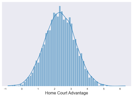 The best part about Stan is you can inspect every single aspect of your model to understand how it’s working. And for free you get to see the uncertainty in every feature of your model. As an illustrative example, our model incorporates home court advantage. And we can directly inspect what the model has learned about home court advantage.